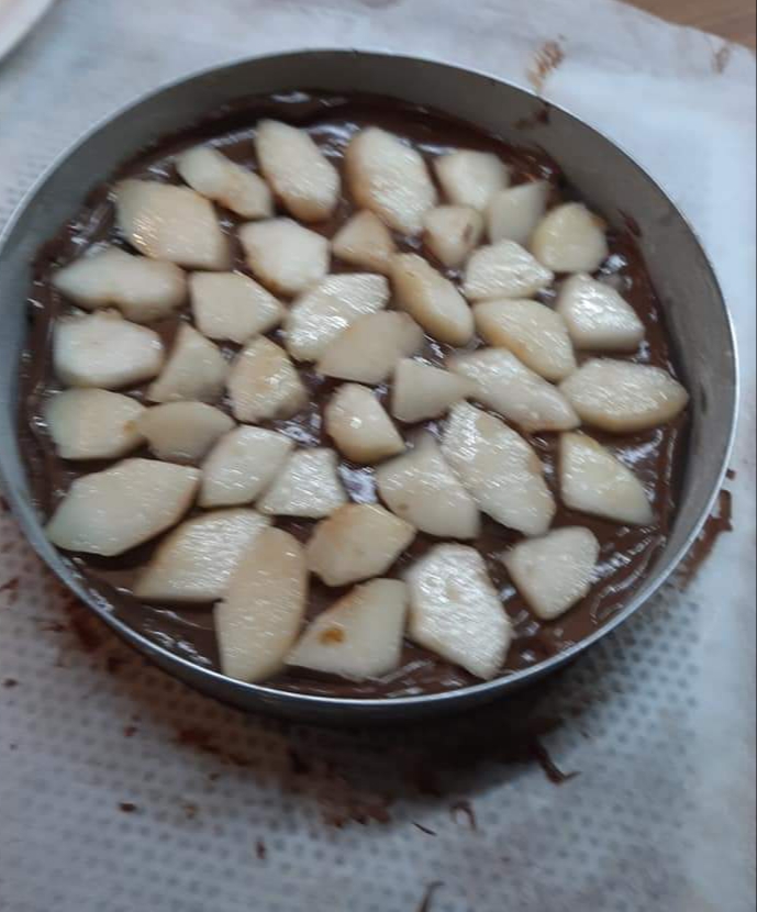 Verser la moitié de cette préparation dans le cercle et lisser avec une spatule coudée. Ajouter les poires ( retirer leur jus avec du papier absorbant avant de les utiliser). Les disposer sur le flan uniformémént.